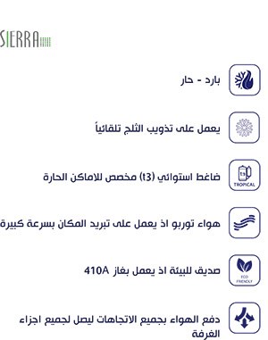 "Turbo air as it cools the place very quickly - environmentally friendly as it works in 410a gas (T3) - a tropical compressor dedicated to hot places - only cold - it works to dissolve the snow automatically - pushing the air in all directions to reach all parts of the room"