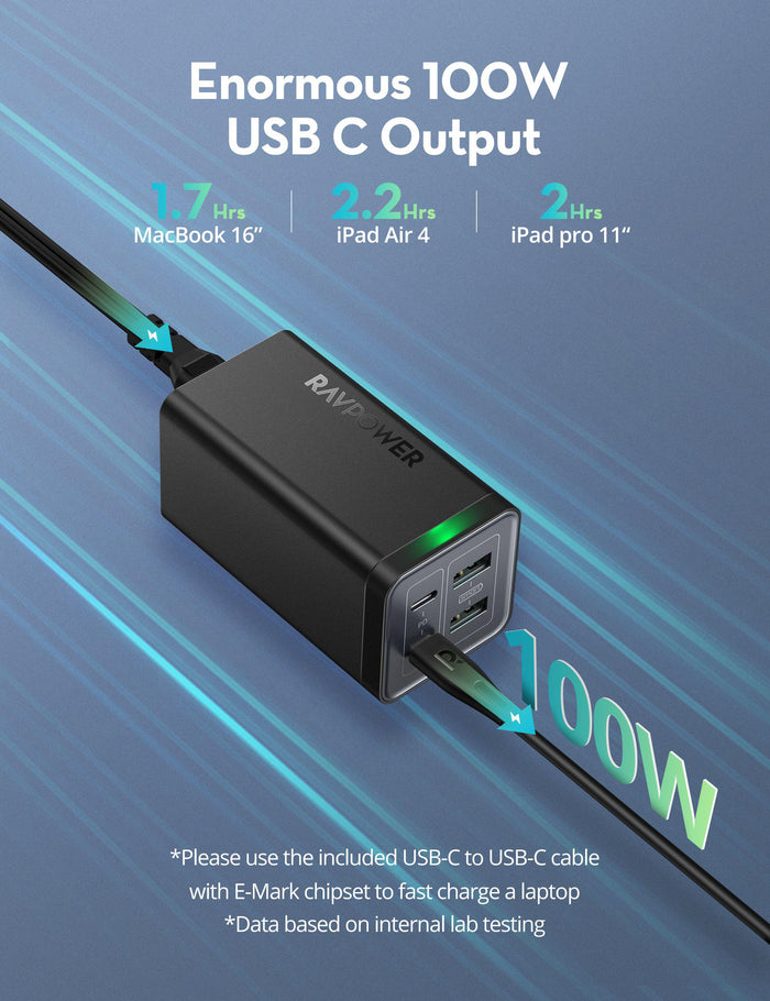 يضخ شاحن سطح المكتب RAVPower طاقة تبلغ 100 واط لنقل جهاز MacBook Pro 16 بوصة من 0 إلى 100% خلال XX ساعة فقط، عندما يكون جهاز واحد فقط متصلاً بمنفذ USB-C. مع منفذي USB-C PD وإخراج إجمالي 120 وات، يمكنك إعادة شحن جهازي MacBook Pro مقاس 13 بوصة بأقصى سرعة في وقت واحد