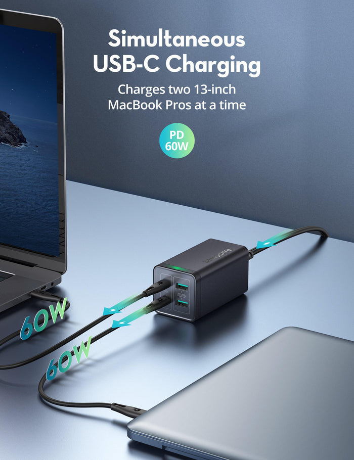 - شحن USB-C متزامن : مع منفذي USB-C PD وإخراج إجمالي 120 واط (60 واط لكل منفذ USB-C)، يمكن لشاحن USB هذا شحن جهازي MacBook Pro مقاس 13 بوصة في المرة الواحدة