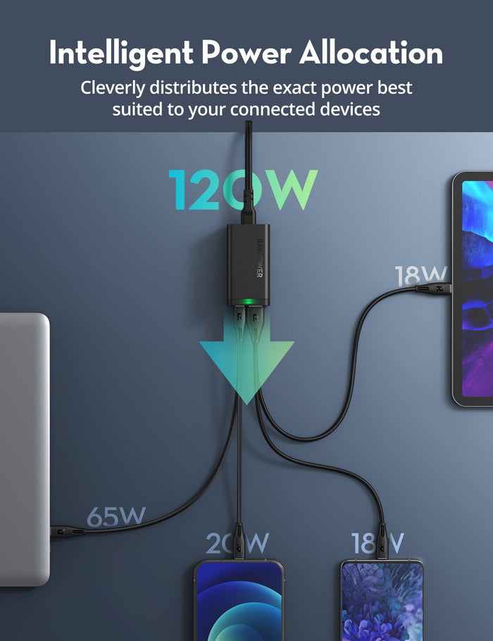 - تخصيص ذكي للطاقة : يوزع 120 واط من الطاقة بذكاء لشحن 4 أجهزة في وقت واحد، مما يضمن حصول جميع أجهزتك المتصلة على شحن عالي السرعة في وقت واحد